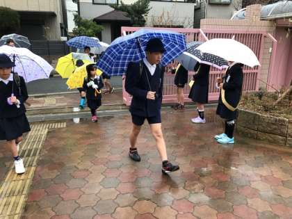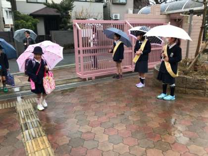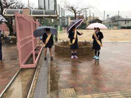 雨の中 元気なあいさつの声が飛び交っていました。