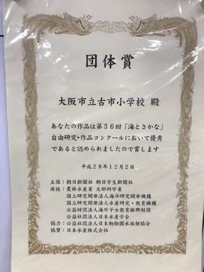 古市小学校の応募活動の取り組みが評価され、
