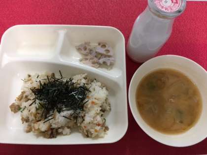 献立は、鶏ごぼうご飯・みそ汁・焼きれんこん・牛乳でした。