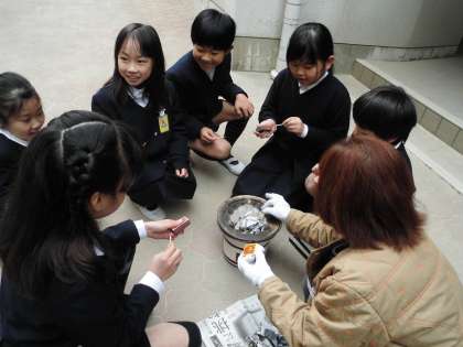 ・七輪(マッチで紙くずに火をつけ、炭に燃え移るよう火吹き竹で空気を送りました。その後、焼いたお餅にきな粉をつけて食べました。)