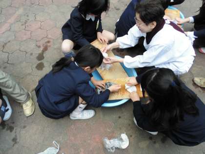 社会科「昔の道具とくらし」の学習として、2,3時間目に昔の人のくらしを体験しました。はぐくみネットの方々が来て下さって、子どもたちに昔の道具の使い方を教えて頂きました。また、保護者の皆様もお手伝いに来て下さりました。