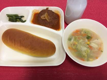 今日の献立は、煮こみハンバーグ・コーンスープ・三度豆のサラダ・パンプキンパン・牛乳でした。
