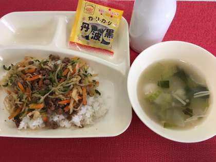 今日の献立は、ビビンバ・トック・いり黒豆・牛乳でした。