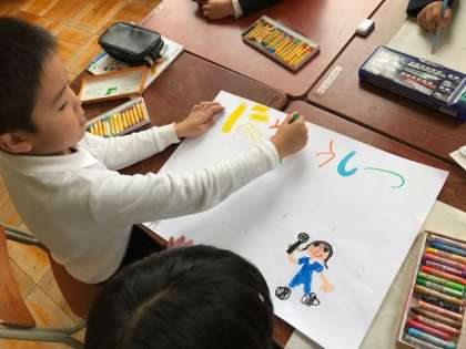 1年生に 学校は案内をするために各教室の表示の絵をかいています。1年生の子ども達が よくわかるように みんなで考えて仕上げています。