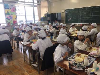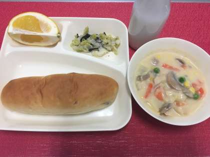 今日の献立は、コーンクリームシチュー・キャベツのひじきドレッシング・河内ばんかん・レーズンパン・牛乳でした。