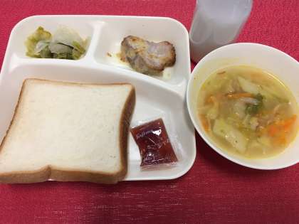 今日の献立は、かつおのガーリックマヨネーズ焼き・スープ・レタスのサラダ・食パン・いちごジャム・牛乳でした。