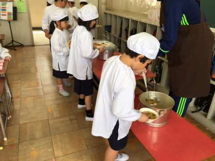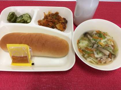 今日の献立は、じゃがいものミートグラタン・スープ・きゅうりのピクルス・大型コッペパン・アプリコットジャム・牛乳でした。