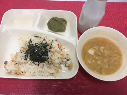 今日の献立は、かやくご飯・みそ汁・まっ茶ういろう・牛乳でした。