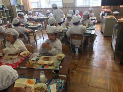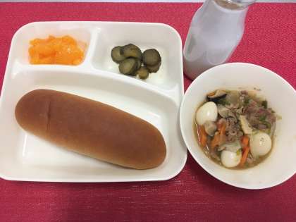 今日の献立は、八宝菜・きゅうりの中華あえ・みかん(缶)・黒糖パン・牛乳でした。