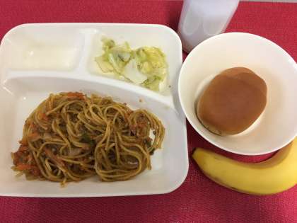 今日の献立は、カレースパゲッティ・キャベツのサラダ・バナナ・黒糖パン・牛乳でした。