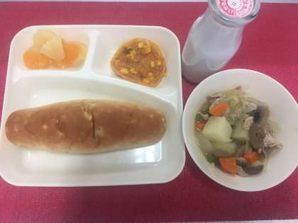 今日の献立は、豚肉と野菜のスープ煮・変わりピザ・ミックスフルーツ(缶)・おさつパン・牛乳でした。
