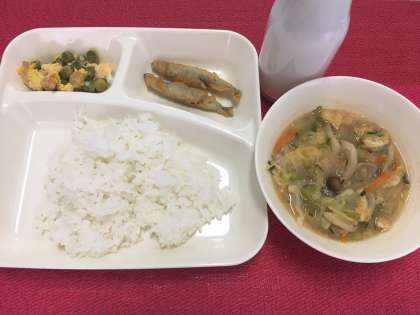 今日の献立は、きびなごてんぷら・みそ汁・えんどうの卵とじ・米飯・牛乳でした。