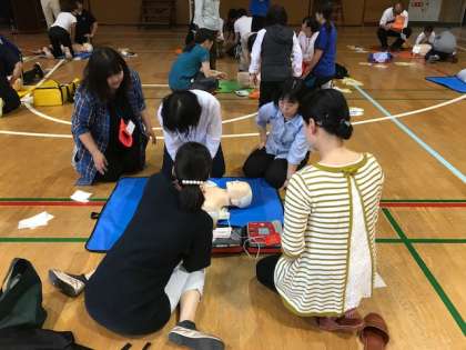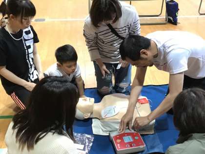 機械のAEDを使って心肺蘇生法を実際に体験しました。