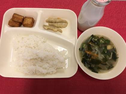 今日の献立は、いわしてんぷら・五目汁・あつあげのしょうがじょうゆかけ・米飯・牛乳でした。