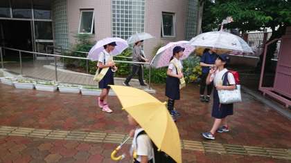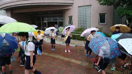 雨の中、子ども達は、登校する子ども達に