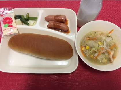 今日の献立は、ウインナーのケチャップソース・野菜スープ・じゃがいもと三度豆のサラダ・黒糖パン・牛乳でした。