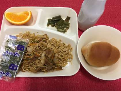 今日の献立は、焼きそば・オクラの中華あえ・オレンジ・黒糖パン・牛乳でした。