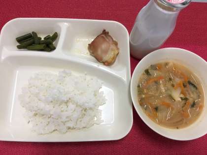 今日の献立は、鶏肉のしょうゆバター焼き・みそ汁・三度豆のからしじょうゆあえ・米飯・牛乳でした。