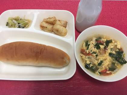 今日の献立は、いかてんぷら・トマトと卵の中華スープ・チンゲンサイともやしのピリ辛あえ・レーズンパン・牛乳でした。