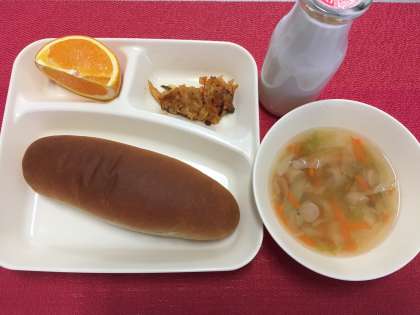 今日の献立は、パエリア・ウインナーとキャベツのスープ・オレンジ・黒糖パン・牛乳でした。