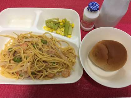 今日の献立は、シーフードトマトスパゲッティ・グリーンアスパラガスとコーンのサラダ・はっ酵乳・黒糖パン・牛乳でした。