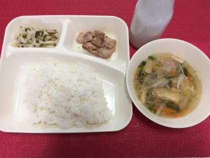 今日の献立は、鶏肉のしょうゆマヨネーズ焼き・五目汁・切り干しだいこんのゆずの香あえ・米飯・牛乳でした。