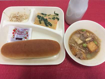 今日の献立は、豚肉と野菜の煮もの・チヂミ・もやしの甘酢あえ・コッペパン・いちごジャム・牛乳でした。