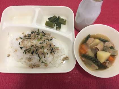 今日の献立は、豚肉とじゃがいもの煮もの・オクラの梅風味・ツナっ葉いため・米飯・牛乳でした。
