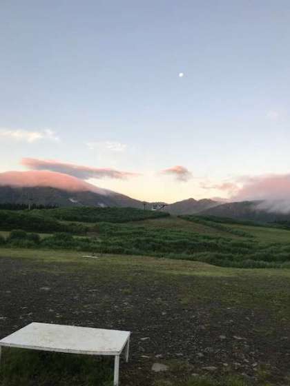 宿舎の前から見る眺めは とても幻想的です。真正面の空高く月が見えます。
