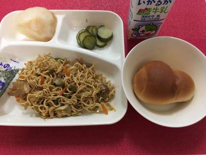 今日の献立は、『焼きそば・きゅうりの甘酢づけ・なし(二十世紀)・黒糖パン・牛乳』でした。