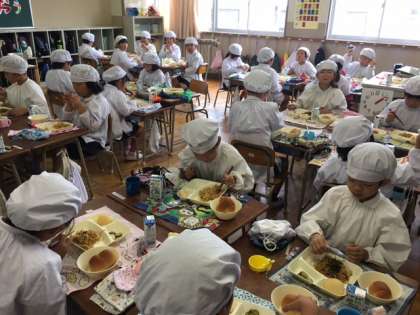 焼きそばは、豚肉、いかを主材にしたソース味の焼きそばです。きざみのりをふりかけて食べます。子ども達に大好評の献立です。