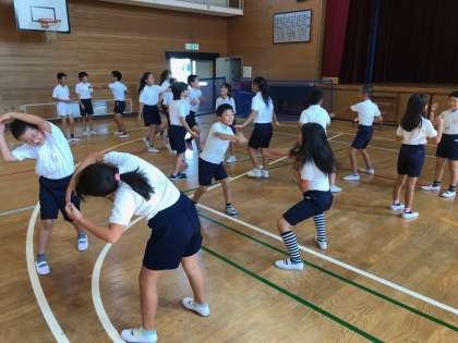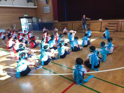 4年生にたすきの巻き方やフレフレ拍子を教えたり、