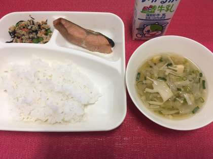 今日の献立は、『さけのしょうゆ風味焼き・五目汁・高野どうふのいり煮・米飯・牛乳』でした。