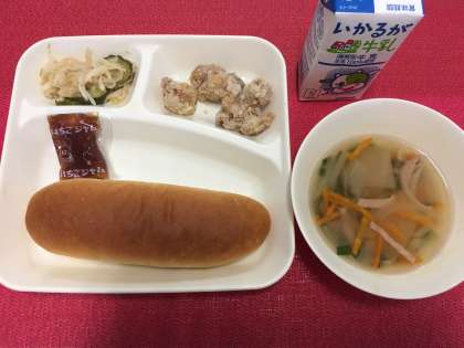今日の献立は、『鶏肉のからあげ・とうがんの中華スープ・切り干しだいこんの辛みづけ・コッペパン・いちごジャム・牛乳』でした。