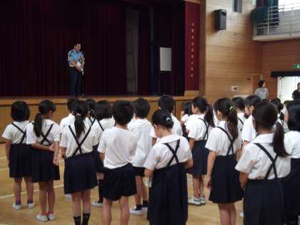7日(月)の児童朝会に、旭警察からおまわりさんが来てくださり