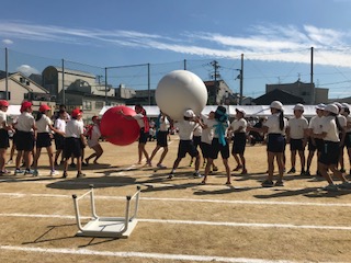 1〜4年生は転がして、5、6年生は頭の上で