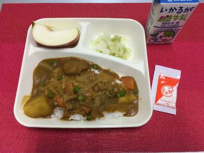 今日の献立は、『ポークライス【米粉】・キャベツのサラダ【ノンエッグドレッシング】・りんご・牛乳』でした。