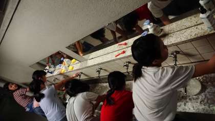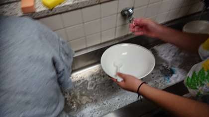 洗い場で食器をきれいしました。