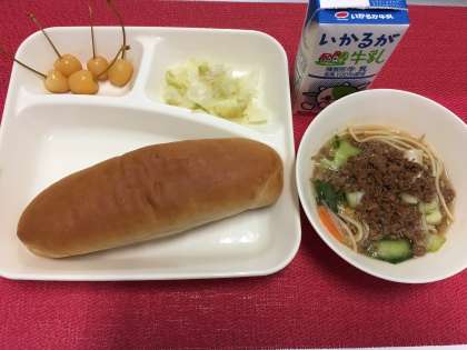 今日の献立は、『タンタンめん・キャベツの甘酢づけ・さくらんぼ(缶)・黒糖パン・牛乳』でした。