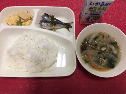 今日の献立は、『いわしのしょうが煮・うすくず汁・高野どうふの卵とじ・米飯・牛乳』でした。