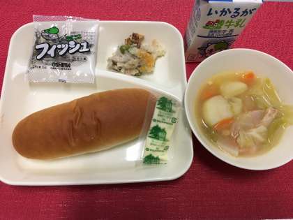 今日の献立は、『鶏肉とじゃがいものスープ煮・きのこのドリア・ミニフィッシュ・コッペパン・ソフトマーガリン・牛乳』でした。