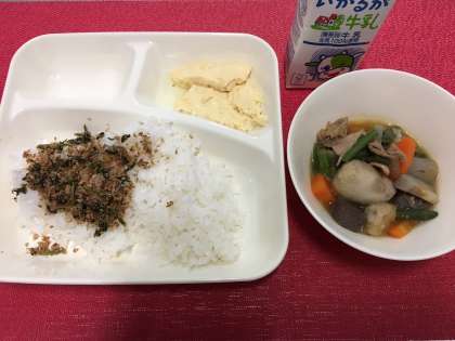今日の献立は、『卵どうふ・豚肉とさといもの煮もの・おかかなっ葉・米飯・牛乳』でした。