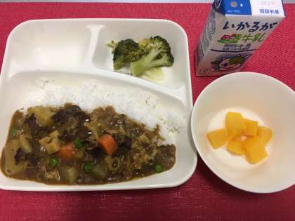 今日の献立は、『冬野菜のカレーライス・ブロッコリーのサラダ・黄桃(カット缶)・牛乳』でした。