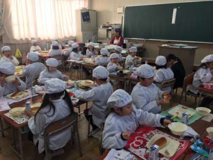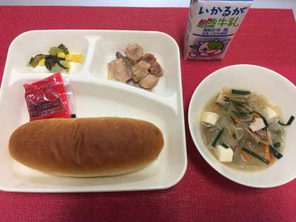 今日から3学期の給食が始まりました。今日の献立は、『鶏肉のオイスターソース焼き・糸寒天のスープ・チンゲンサイとコーンの中華あえ・コッペパン・いちごジャム・牛乳』でした。