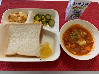 今日の献立は、『豚肉と野菜のケチャップ煮・きゅうりとコーンのサラダ・桃のクラフティ・食パン・マーマレード・牛乳』でした。