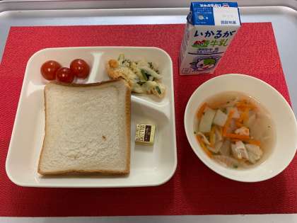 今日の献立は、『ほたて貝のグラタン・だいこんのスープ・プチトマト・食パン・バター・牛乳』でした。