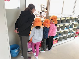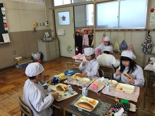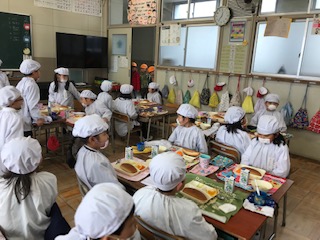 清水保育所の子どもたちが 1年生の給食の様子を参観に来ました。