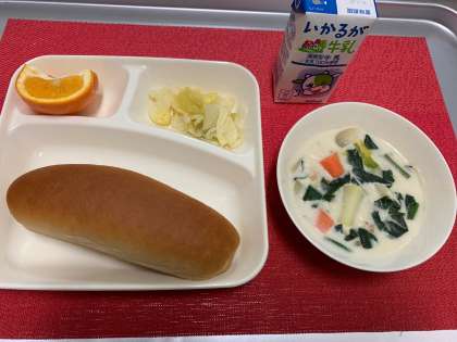 今日の献立は、『ほうれん草のクリームシチュー・キャベツのサラダ・いよかん・黒糖パン・牛乳』でした。