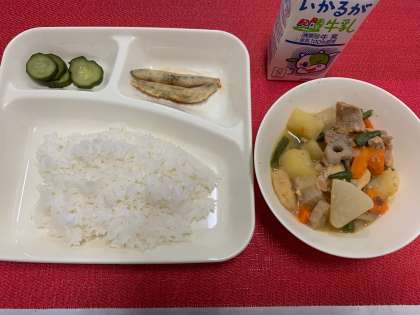 今日の献立は、『きびなごてんぷら・一口がんもとだいこんの煮もの・あっさりきゅうり・米飯・牛乳』でした。