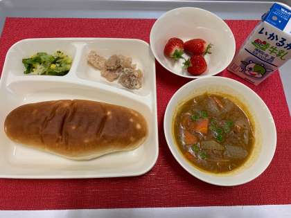 今日の献立は、卒業祝い献立で『フライドチキン・カレーシチュー・春のカラフルソテー・いちご・おさつパン・牛乳』でした。